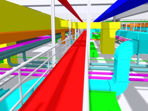 復因項目建筑面積6000平方米,其中凈化廠房面積2500平方米,主體結構以潔凈工程為主,存在夾層空間較小從而導致管道密集的問題。天俱時集團BIM中心團隊為解決這一難題,助力業主在后期清晰分辨送風與排風系統以提高維護效率,通過BIM技術將送風與排風管道分別設置于兩個不同的高度層面,大大提高了送排風系統的空間管理性。